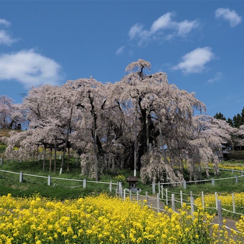 福岛县三春町的泷樱是日本三大樱花之一。 它是第一棵被指定为国家天然纪念物的著名樱花树。 这是一棵古老的树,红色的树枝和下垂的樱花树,据说已有1000多年的历史,但是当它盛开时,它看起来像瀑布层层流淌下来。 去的那天,当地人说条件最好,蓝天,鲜艳的油菜花色,盛开的樱花让我享受春天的灿烂。 据说他说:“到首都,我能听到声音,泷樱,邀请伊洛卡和花朵的春风。